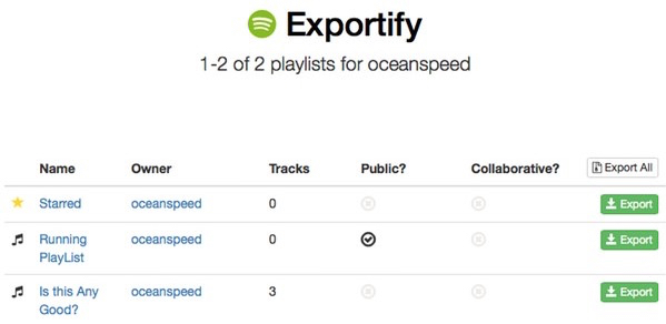 La herramienta ofrece una interfaz que utiliza la API Web de Spotify, para exportar nuestras listas de reproducción. Esta página nos permite ver las listas con las que contamos en modo lectura, así como el número de canciones que compone a cada una. Para exportar las listas que queramos, debemos pulsar el botón Export All o los botones Export por separado y listo. -- El Universal