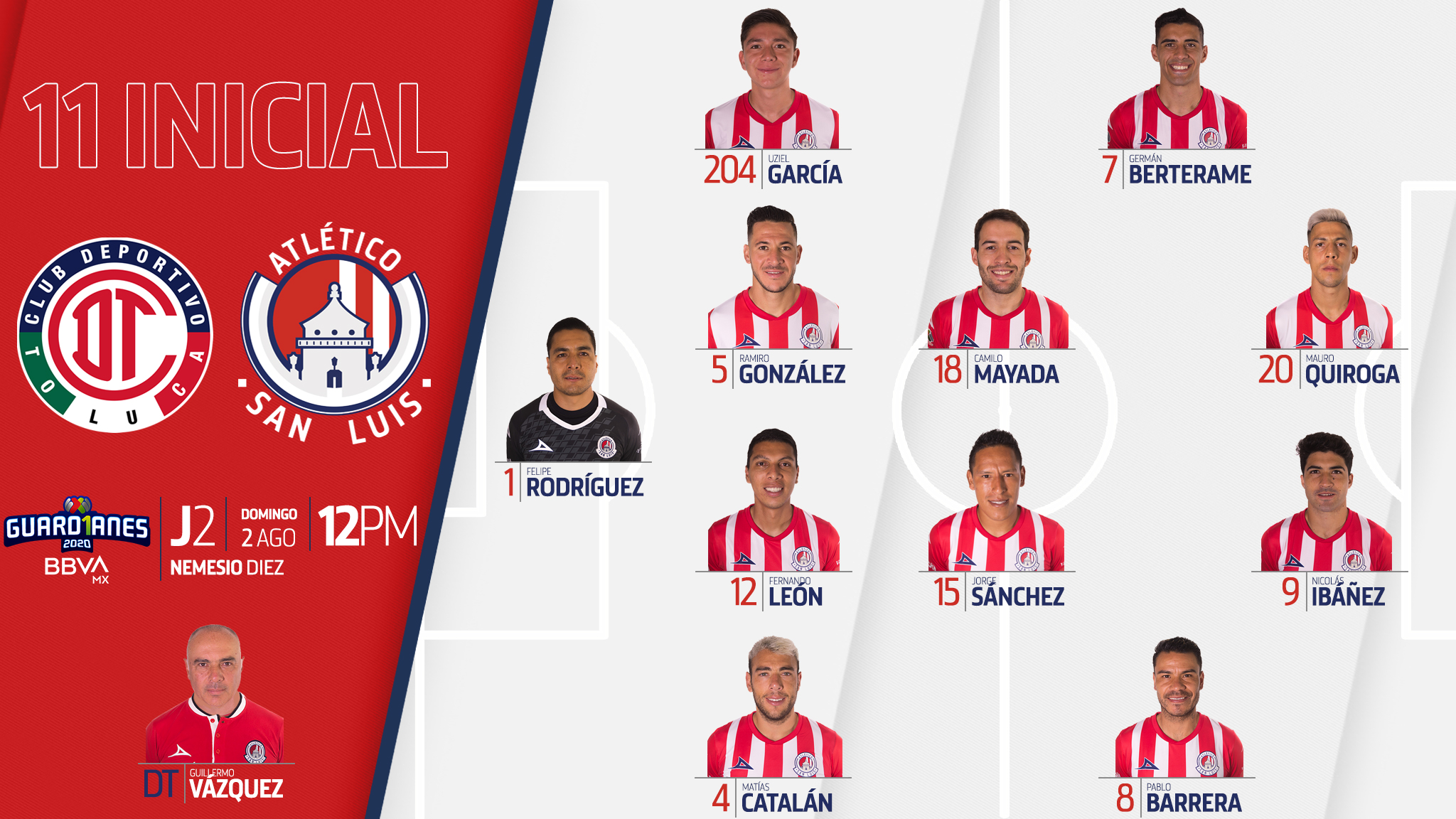 Deporte LocalSan Luis Potosí, S.L.P.- Atlético de San Luis definió al cuadro titular que arrancará el cotejo ante los Diablos Rojos del Toluca, con sorpresas en los nombres de algunos futbolistas para el cotejo correspondiente a la Fecha 2 de la Liga Mx torneo Guard1anes 2020. El equipo rojiblanco tendrán en la puerta a Felipe Rodríguez; en la defensa estarán Matías Catalán, Luis León, Ramiro González y el juvenil Uziel rioverdense “Uche” García, quien debutará en Liga Mx como lateral izquierdo. En medio campo reaparece Jorge “Perrito” Sánchez junto a Camilo Mayada en la conteción, por derecha Pablo Barrera y por izquierda Germán Berterame; en la delantera va la dupla de Nicolás Ibáñez y Mauro Quiroga. Cabe señalar que en la banca San Luis cuenta con Axel Werner, Dionicio Escalante, Rodrigo Noya, Diego Nava, Juan David Castro, Anderson Julio, Pablo López, Diego Pineda y Brandon Abundis. El encuentro arrancará a las 12 del día con transmisión por TUDN y el arbitraje del encuentro estará a cargo de Diego Montaño.