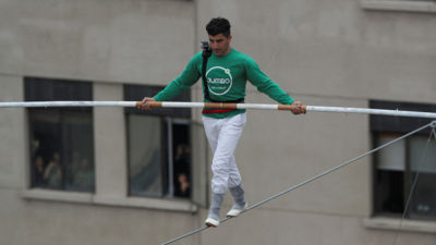 El acróbata ha caminado sobre un cable tensado a unos 50 metros de altura en Santiago de Chile como parte de su gira 'Guardianes del Bosque'