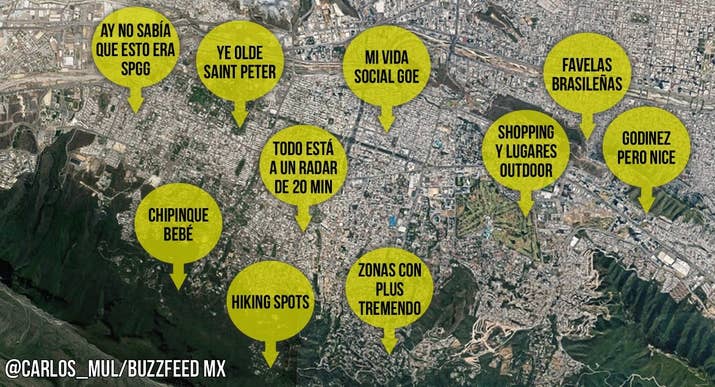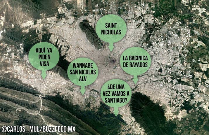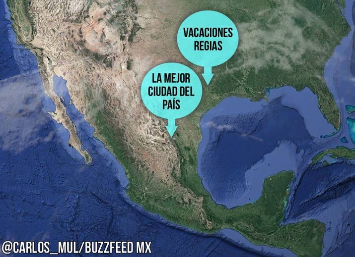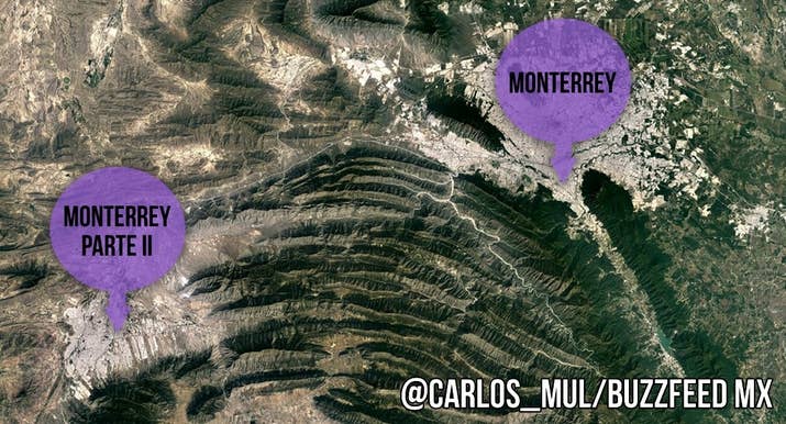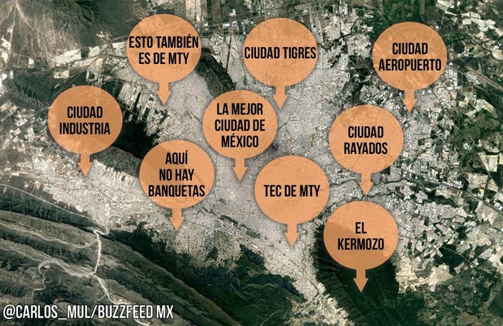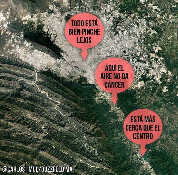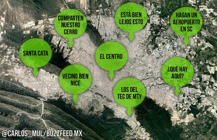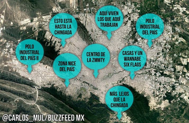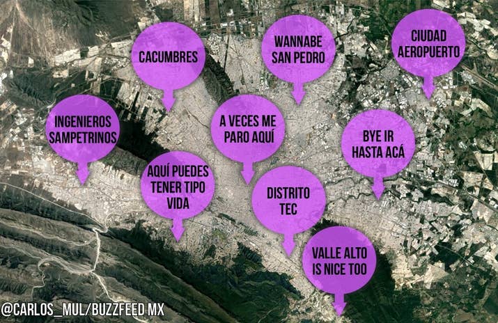 1. La Zona Metropolitana de MTY según todos sus habitantes: 2. La Zona Metropolitana según los habitantes de Monterrey: 3. La Zona Metropolitana según los de Santa Catarina: 4. La Zona Metropolitana de acuerdo con la gente que vive en Carretera Nacional, (básicamente Santiago): 5. La Zona Metropolitana según los sampetrinos: 6. San Pedro según los sampetrinos: 7. La Zona Metropolitana según los nicolaitas: 8. La Zona Metropolitana según la gente de Guadalupe: 9. La Zona Metropolitana según la gente de Apodaca: 10. Saltillo según los regios: 11. Monterrey según los saltillenses: 12. Norteamérica según los regios: -- BuzzFeed
