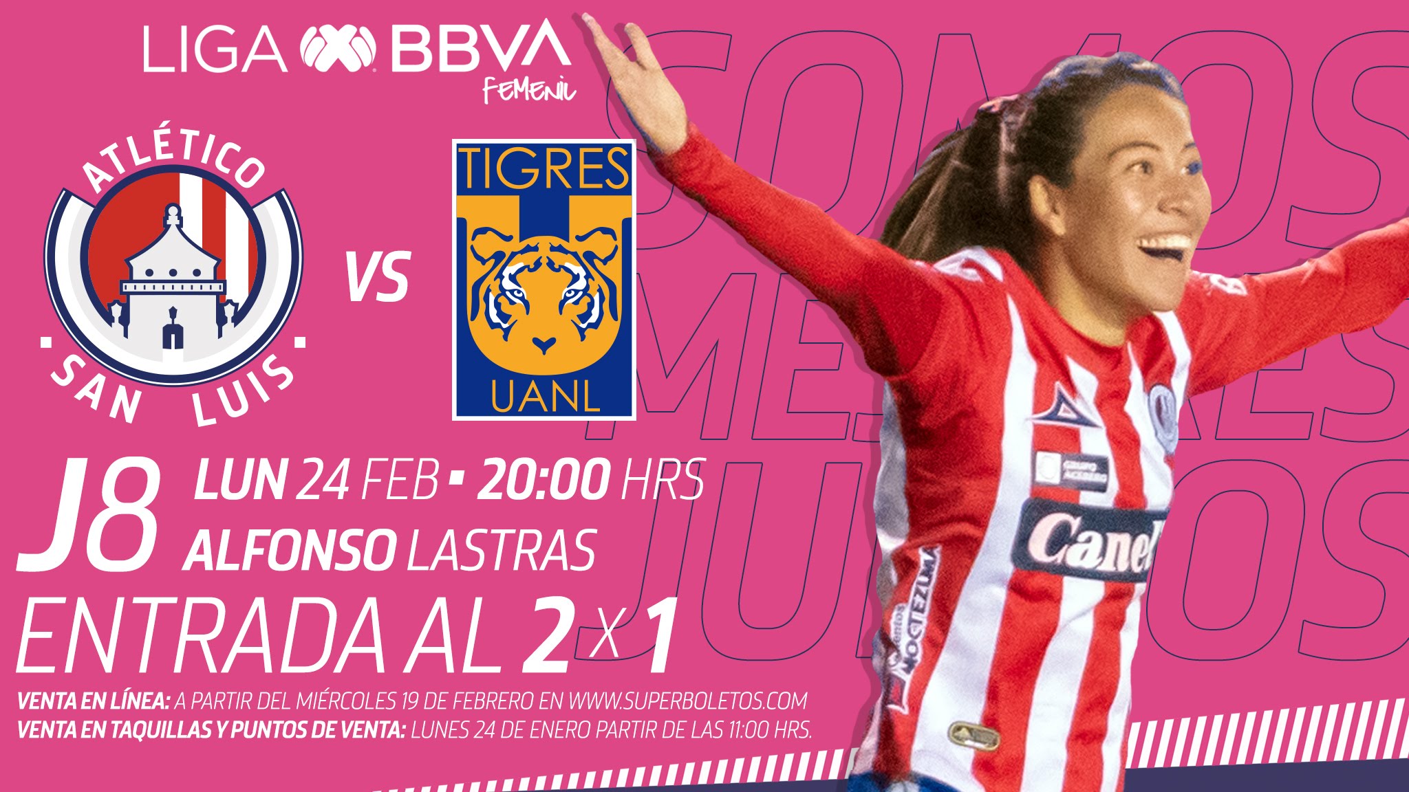 Deporte LocalSan Luis Potosí, S.L.P.- Atlético de San Luis Femenil lanzó la dinámica para los boletos de su próximo compromiso en el Clausura 2020 ante Tigres de Nuevo León, equipo protagonista en la Liga Mx Femenil, encuentro que será el próximo lunes en el Estadio Alfonso Lastras. El equipo rojiblanco informó a través de las redes sociales que las entradas estarán al 2x1, destacando que la venta en línea arranca desde éste miércoles 19 de febrero en el portal de superboletos. Por su parte en las taquillas y puntos de venta será únicamente el lunes 24 de febrero a partir de las 11 de la mañana. El partido de la Fecha 8 del torneo entre San Luis y Tigres será a las 8 de la noche en el Estadio Alfonso Lastras, partido para el cual las rojiblancas llegan de empatar en Puebla y las felinas