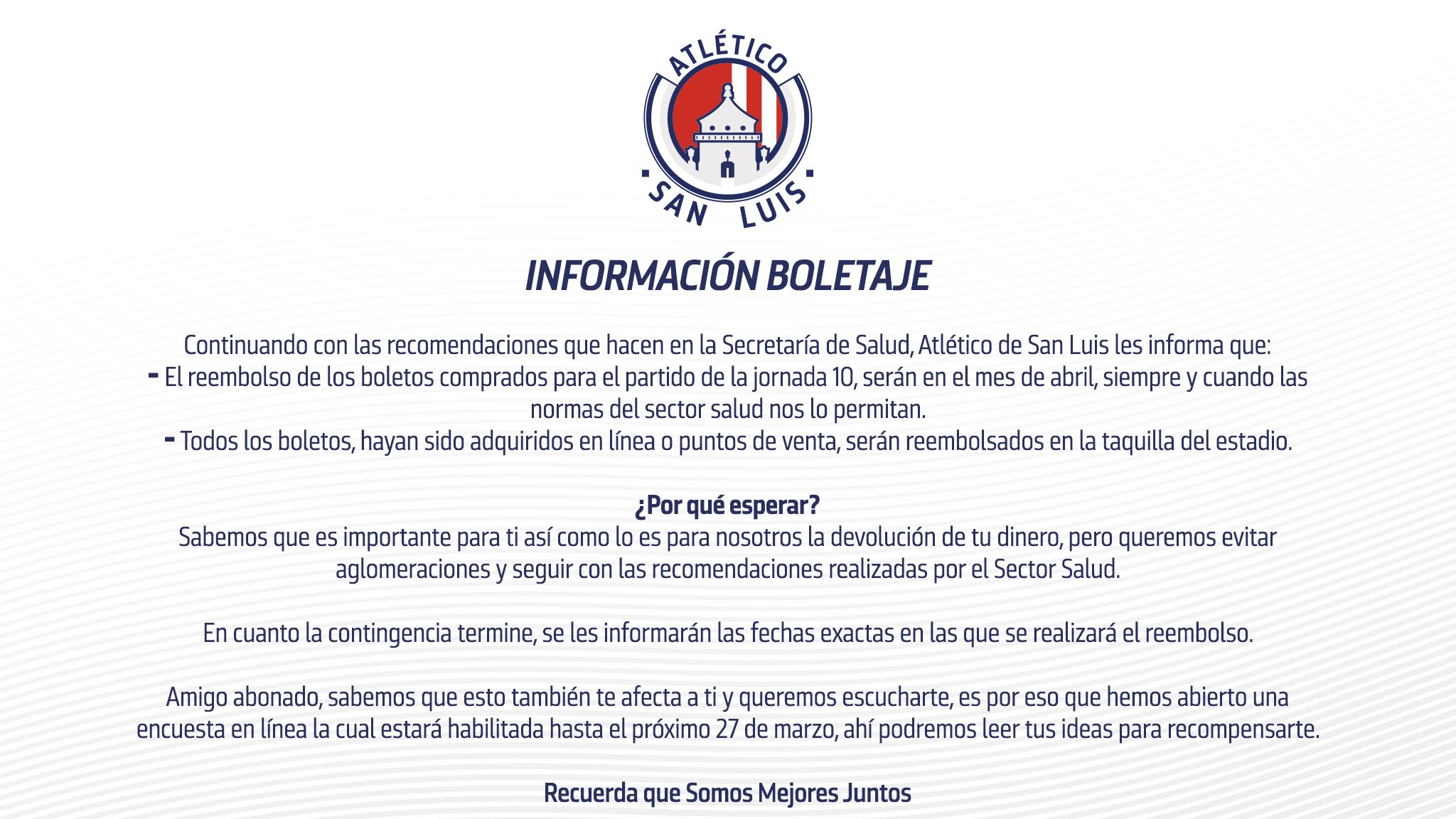 Deporte LocalSan Luis Potosí, S.L.P.- Tras darse a conocer en diferentes equipos de la Liga Mx un rembolso por los juegos a puerta cerrada de la Liga Mx en la Jornada 10, Atlético de San Luis emitió un comunicado para dar a conocer que sí se regresará el respectivo dinero a los aficionados y tendrá una encuesta directa con los abonados, para buscar alguna forma de compensar dicha situación. A través de un comunicado en redes sociales, Atlético informó que atenderán las indicaciones de la Secretaría de Salud y las medidas preventivas para evitar el contagio del coronavirus. Por lo anterior, se precisó que será en fecha por determinar en abril en la que se reembolse el dinero a la afición. Así mimo, se precisó que las taquillas del Estadio será donde se devuelva el dinero del juego ante Puebla, correspondiente a la Fecha 10 del Clausura 2020. Respecto al abonado, se precisó que a través del link bit.ly/33xryDo se podrá responder una encuesta habilitada hasta el 27 de marzo, donde el club rojiblanco busca ideas para compensar el cotejo que fue a puerta cerrada y el cual ya estaba incluido en el abono.