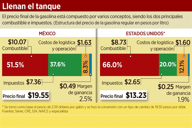 El margen neto de ganancia -descontando costos de logística y operación- de las estaciones de servicio en México por litro de gasolina es de alrededor de 49 centavos de peso por litro, cifra que casi duplica al de los gasolineros en Estados Unidos. La Asociación Nacional de Tiendas de Conveniencia (NAICS, por sus siglas en inglés) refiere que en Estados Unidos la ganancia es de alrededor de 5 centavos de dólar por galón, que en términos de pesos por litro representarían aproximadamente 25 centavos de peso a un tipo de cambio de 19.30 pesos. Así, el margen de ganancia de los gasolineros estadounidenses es de 1.9 por ciento del precio final promedio de marzo, de 2.59 dólares por galón de la gasolina regular en el País, según datos de la EIA. Por su parte, Ramsés Pech, especialista del sector energético, señaló que el margen neto de ganancia de los gasolineros en México es actualmente de entre 2 y 3 por ciento del precio final del combustible. Así, considerando que el promedio del margen de ganancia en México es de 2.5 por ciento y que el precio promedio de la gasolina regular fue de 19.55 pesos por litro, la ganancia de los gasolineros sería de aproximadamente 49 centavos de peso en la gasolina Magna. Pech resaltó que la diferencia entre el margen de ganancia en Estados Unidos y México es similar en términos porcentuales. Alejandra Palacios, presidenta de la Comisión Federal de Competencia Económica (Cofece), declaró ante medios la semana pasada que los márgenes sí han aumentado. "Sí hay un problema de pocas estaciones de servicio en este País, eso hace que los expendedores tengan mayor posibilidad de cobrar márgenes más altos", sostuvo. A septiembre del 2018 existían 12 mil 073 estaciones de servicio en México, con lo que la densidad de gasolineras respecto al parque vehicular por punto de venta es de una por cada 3 mil 429 autos. Por el contrario, en Estados Unidos la cobertura era de mil 567 vehículos por estación, refieren datos de la Secretaría de Energía. La Cofece ha sugerido que para elevar la competencia se deben eliminar barreras regulatorias como los reglamentos que marcan distancias mínimas para instalar expendios, los obstáculos para una apertura efectiva de la infraestructura de transporte y almacenamiento de petrolíferos de Pemex y la promoción de mayor inversión privada en infraestructura. Tomando en cuenta el margen bruto, es decir, incluyendo los costos de logística y operación, en México se pagaron alrededor de 2.12 pesos por litro, monto que representaría el 10.8 por ciento del precio final. En cuanto a los impuestos -incluyendo el IEPS federal descontando el estímulo fiscal, el impuesto al carbono, el IEPS estatal y el IVA que además se cobra sobre los otros tres impuestos-, el pago de los consumidores durante marzo fue en promedio de 7.36 pesos por litro de gasolina, equivalentes al 37.6 por ciento del precio. En Estados Unidos, los consumidores pagan un promedio de 20 por ciento del precio final, es decir, de 52 centavos de dólar por galón o 2.65 pesos por litro. --