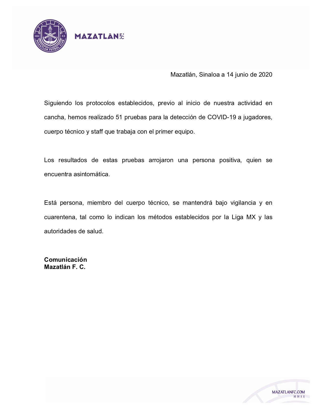 Mazatlán FC informó que encontraron un miembro del cuerpo técnico positivo a Covid-19 después de las pruebas médicas que realizaron a los integrantes del primer equipo para detectar dicho virus y así proceder a los entrenamientos de preparación para el inicio del Apertura 2020. A través de un comunicado, el club sinaloense dio a conocer que de 51 pruebas que realizaron, solo una persona dio positivo, misma que es asintomática y está bajo cuidado médico constante y en aislamiento. “Esta persona, miembro del cuerpo técnico, se mantendrá bajo vigilancia y en cuarentena, tal como lo indican los métodos establecidos por la Liga MX y las autoridades de salud”, se lee en el texto. Esta semana han llegado los integrantes del nuevo equipo de la Liga MX tales como Aldo Rocha y el nuevo director técnico, Francisco Palencia. De a poco se integrará el resto de integrantes de Morelia y que tienen contrato con el club.
