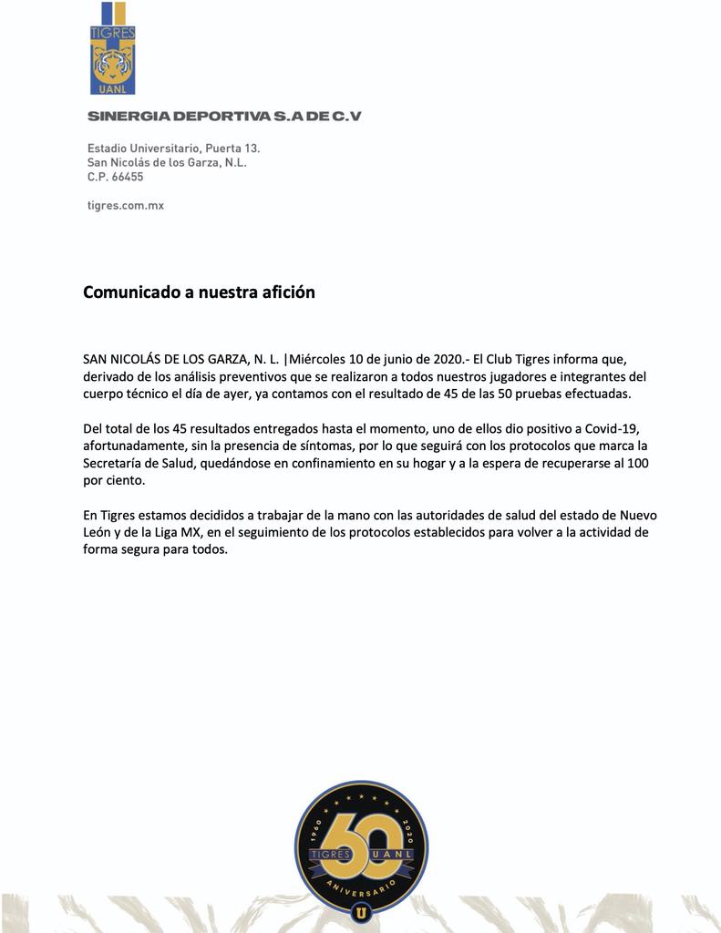 Foto: Agencia Mexsport Los Tigres informaron que recibieron 45 resultados de las 50 pruebas de Covid-19 que realizaron ayer jugadores, cuerpo técnico, médico y elementos de seguridad de la institución. Solamente hubo un caso positivo, el cual es asintomático y que minutos después el jugador Francisco Meza pidió se informara que él es el futbolista diagnosticado. “Seguirá los protocolos que marca la Secretaría de Salud, quedándose en confinamiento en su hogar y a la espera de recuperarse al 100 por ciento”, según indicó el cuadro regiomontano a través de un comunicado. De esta manera, los Tigres se unen a la lista de nueve equipos de la Liga MX que ya han reportado por lo menos un caso positivo de Covid-19 en su institución. Santos, Pumas, Cruz Azul, Chivas, León, Atlético San Luis, Monterrey y Toluca son los otros ocho. --