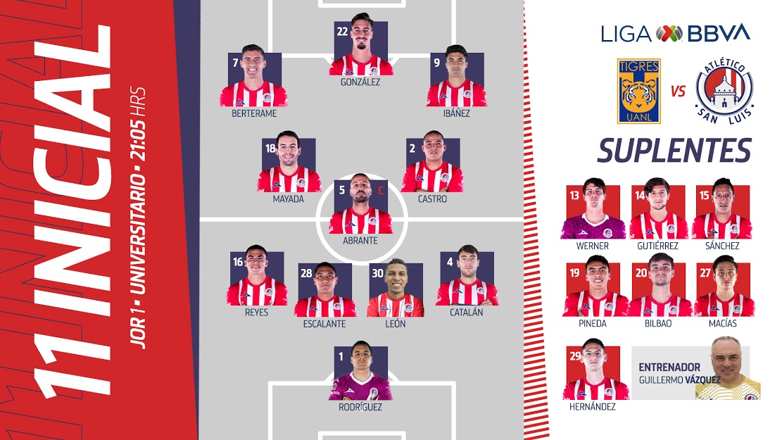 Deporte LocalSan Luis Potosí, S.L.P.- Sin registro de último minuto con el chileno Felipe Gallegos, Atlético de San Luis y Tigres definieron sus alineaciones para el Jornada 1 del Clausura 2020 en la Liga Mx en el Volcán. Atlético de San Luis arrancará con Felipe Rodríguez en la puerta; Matías Catalán, Luis León, Dionicio Escalante y Luis Reyes en la defensa; Juan David Castro, Mario Abrante y Camilo Mayada en mediocampo; así como Germán Berterame, Ian González y Nicolás Ibáñez. Tigres de Nuevo León comenzará con Nahuel Guzmán, Hugo Ayala, Diego Reyes, Juan Martínez, Rafael Carioca, Guido Pizarro, Javier Aquino, Jesús Dueñas, Eduardo Vargas, André Pierre Gignac y Nicolás López. El partido arrancará en punto de las 9 de la noche con 5 minutos con transmisión a través del Canal de las Estrellas y TUDN.